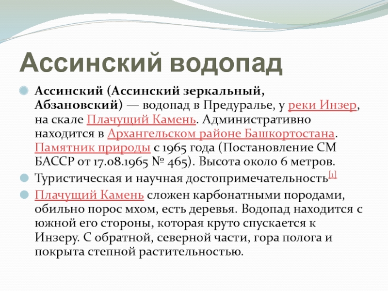 Ассинский (Ассинский зеркальный, Абзановский) — водопад в Предуралье, у реки Инзер,
