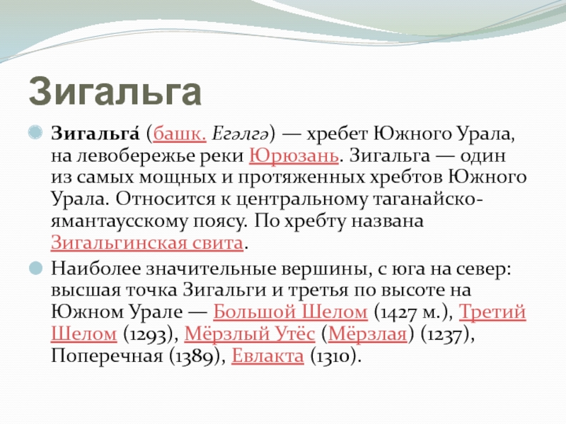 Зигальга́ (башк. Егәлгә) — хребет Южного Урала, на левобережье реки Юрюзань. Зигальга —