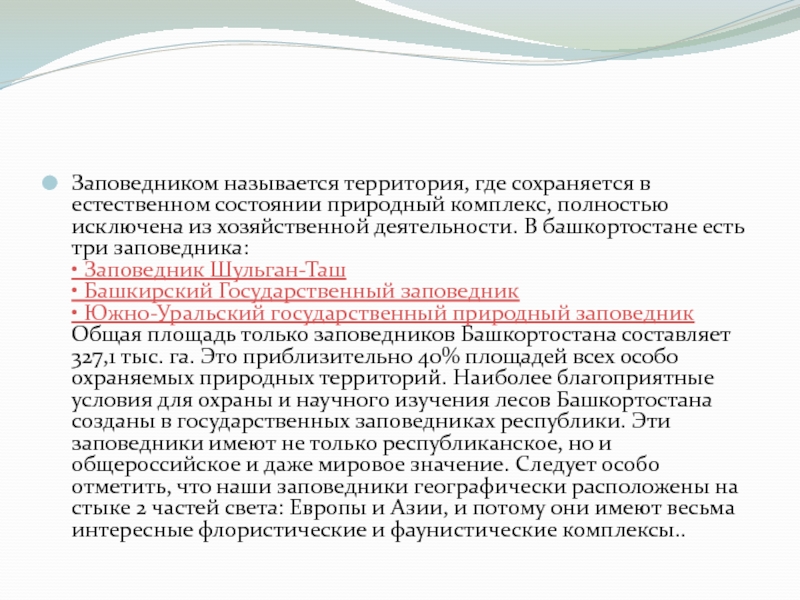 Общая площадь только заповедников Башкортостана составляет 327,1 тыс. га. Это приблизительно 40% площадей всех особо охраняемых природных территорий. Наиболее благоприятные условия для охраны и научного изучения лесов Башкортостана созданы в государственных заповедниках республики. Эти заповедники имеют не только республиканское, но и общероссийское и даже мировое значение. Следует особо отметить, что наши заповедники географически расположены на стыке 2 частей света: Европы и Азии, и потому они имеют весьма интересные флористические и фаунистические комплексы..