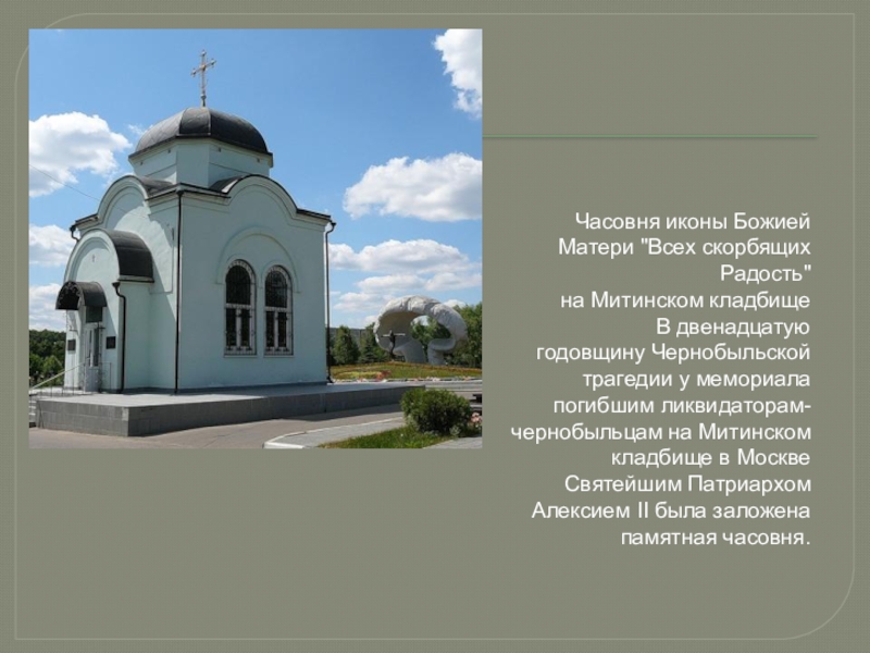 В двенадцатую годовщину Чернобыльской трагедии у мемориала погибшим ликвидаторам-чернобыльцам на Митинском кладбище в Москве Святейшим Патриархом Алексием II была заложена памятная часовня.