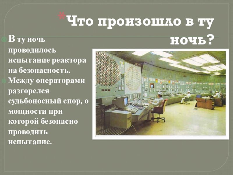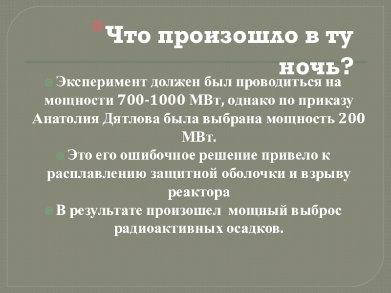 Это его ошибочное решение привело к расплавлению защитной оболочки и взрыву реактора