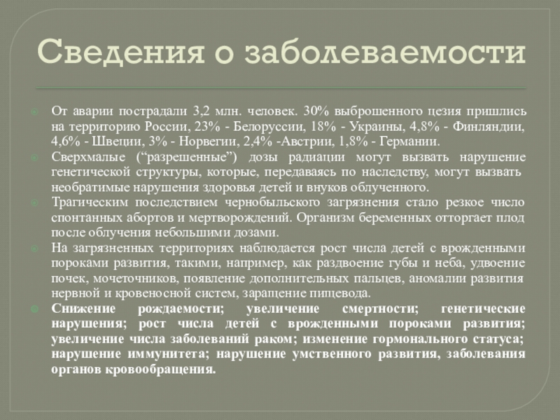На загрязненных территориях наблюдается рост числа детей с врожденными пороками развития, такими, например, как раздвоение губы и неба, удвоение почек, мочеточников, появление дополнительных пальцев, аномалии развития нервной и кровеносной систем, заращение пищевода.