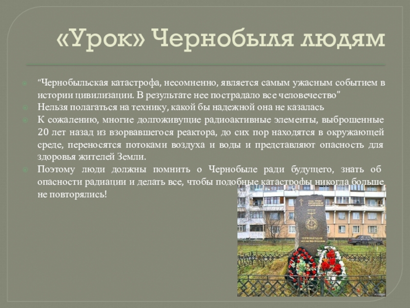 Поэтому люди должны помнить о Чернобыле ради будущего, знать об опасности радиации и делать все, чтобы подобные катастрофы никогда больше не повторялись!