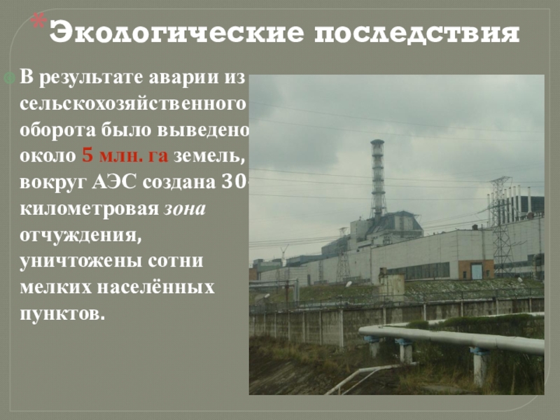 млн. га земель, вокруг АЭС создана 30-километровая зона отчуждения, уничтожены сотни мелких населённых пунктов.