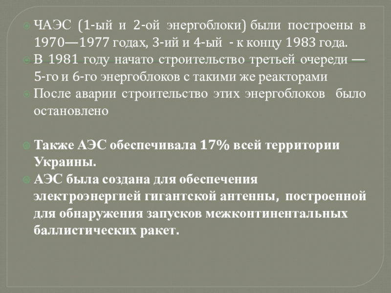 Слайд 9ЧАЭС (1-ый и 2-ой энергоблоки) были построены в 1970—1977 годах, 3-ий и 4-ый -