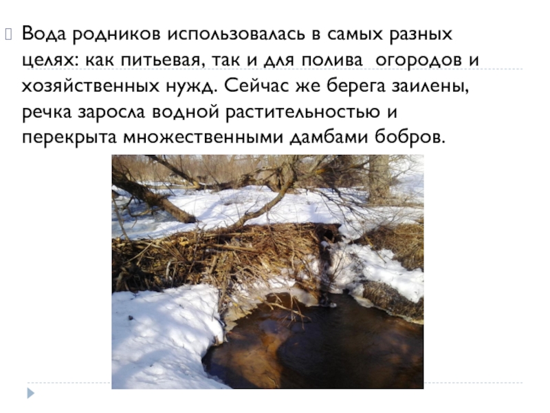 Слайд 11Вода родников использовалась в самых разных целях: как питьевая, так и