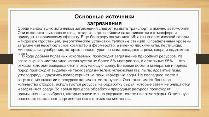 В ходе добычи полезных ископаемых, происходит загрязнение природных ресурсов. Из всего сырья в чистом виде используется не более 5% материалов, а остальные 95% — это отходы, которые возвращаются в окружающую среду. Во время добычи минералов и горных пород происходит выделение таких загрязнителей: углекислый газ; пыль; ядовитые газы; углеводороды; двуокись азота; сернистые газы; карьерные воды. Не последнее место в загрязнение экологии и ресурсов занимает металлургия. Она также имеет большое количество отходов, используются ресурсы на обработку сырья, которые затем не очищаются и загрязняют среду. Во время процесса обработки природных ресурсов происходят промышленные выбросы, которые значительно ухудшают состояние атмосферы. Отдельную опасность составляет загрязнение пылью тяжелых металлов.
