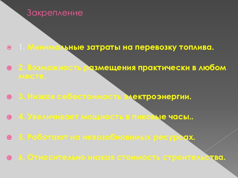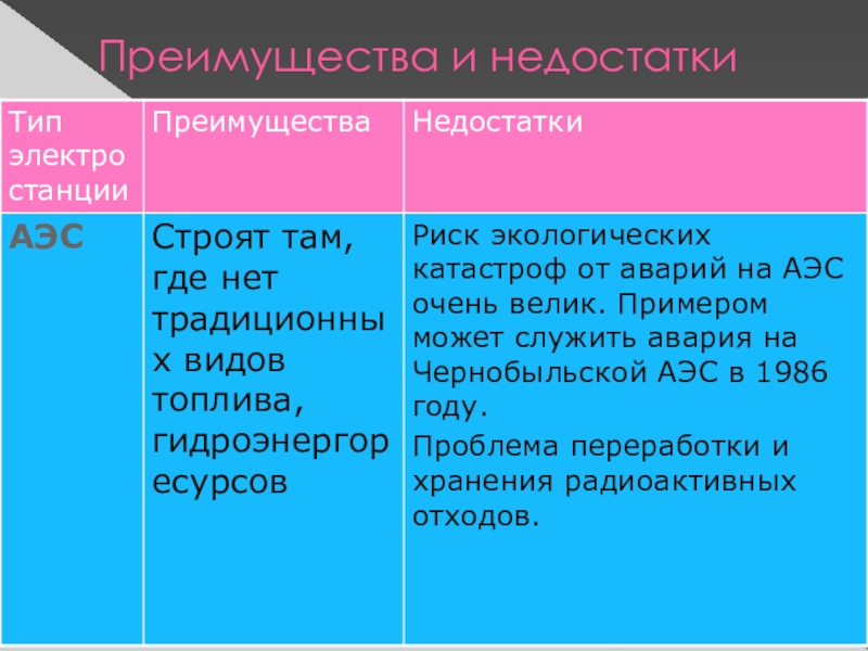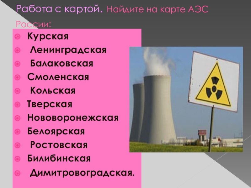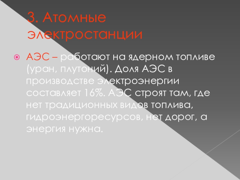 АЭС в производстве электроэнергии составляет 16%. АЭС строят там, где нет традиционных видов топлива, гидроэнергоресурсов, нет дорог, а энергия нужна.