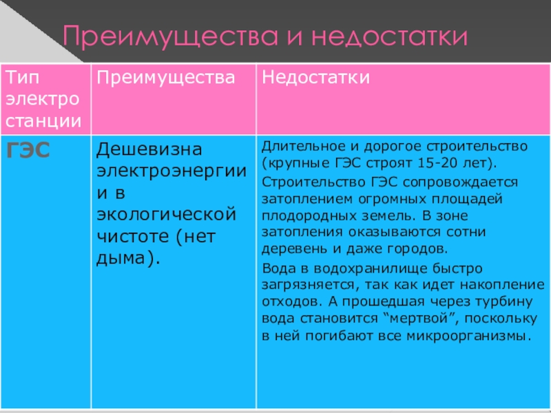 Преимущества ГЭС заключаются в дешевизне электроэнергии и в экологической чистоте (нет дыма).