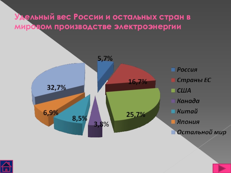 Слайд 14Удельный вес России и остальных стран в мировом производстве электроэнергии