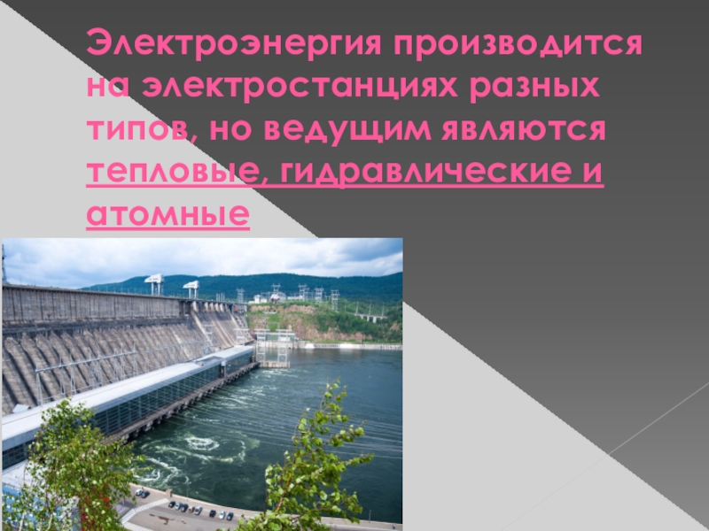 Слайд 8Электроэнергия производится на электростанциях разных типов, но ведущим являются тепловые, гидравлические