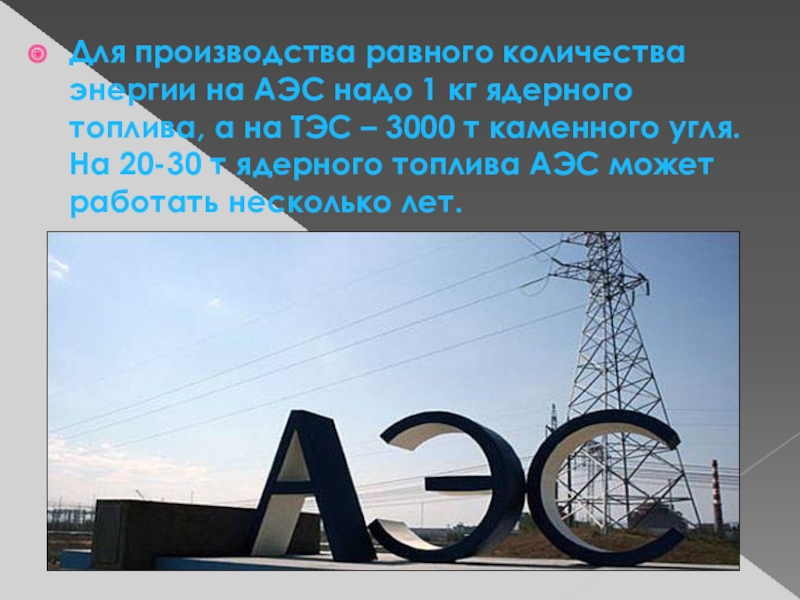 топлива, а на ТЭС – 3000 т каменного угля. На 20-30 т ядерного топлива АЭС может работать несколько лет.