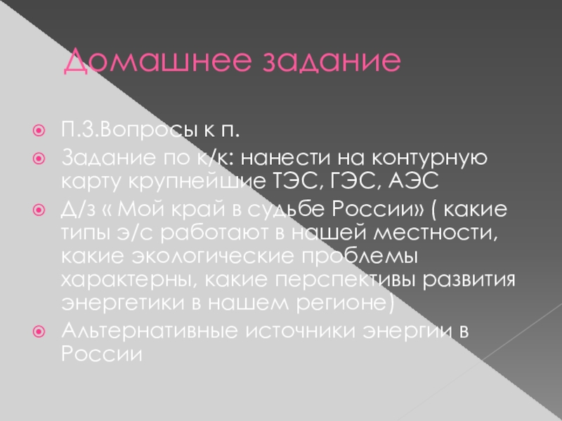 Д/з « Мой край в судьбе России» ( какие типы э/с работают в нашей местности, какие экологические проблемы характерны, какие перспективы развития энергетики в нашем регионе)