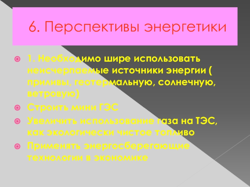 1. Необходимо шире использовать неисчерпаемые источники энергии ( приливы,