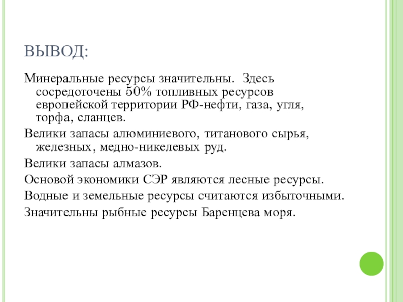 ВЫВОД:Минеральные ресурсы значительны. Здесь сосредоточены 50% топливных ресурсов европейской территории РФ-нефти, газа, угля, торфа, сланцев.Велики запасы алюминиевого,