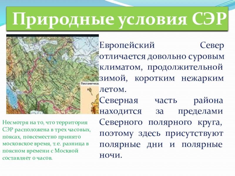 Несмотря на то, что территория СЭР расположена в трех часовых, поясах, повсеместно принято московское время, т.е. разница в поясном времени с Москвой составляет 0 часов.