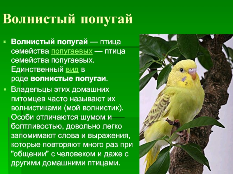 Волнистый попугай — птица семейства попугаевых — птица семейства попугаевых. Единственный вид в роде волнистые попугаи.