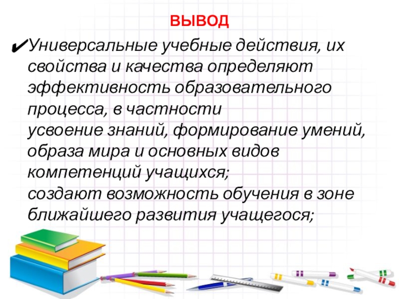 Слайд 19Универсальные учебные действия, их свойства и качества определяют эффективность образовательного процесса,