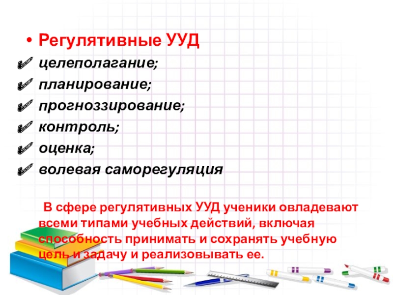 В сфере регулятивных УУД ученики овладевают всеми типами учебных