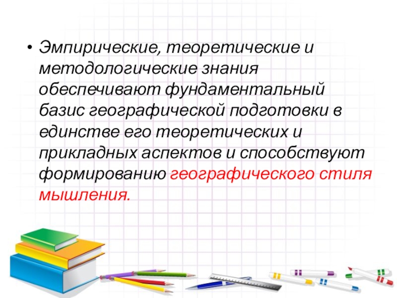 Слайд 3Эмпирические, теоретические и методологические знания обеспечивают фундаментальный базис географической подготовки в