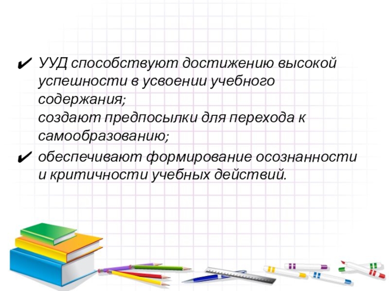 Слайд 20УУД способствуют достижению высокой успешности в усвоении учебного содержания;