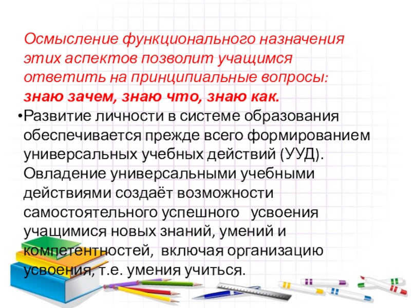 Слайд 6Осмысление функционального назначения этих аспектов позволит учащимся ответить на принципиальные вопросы: