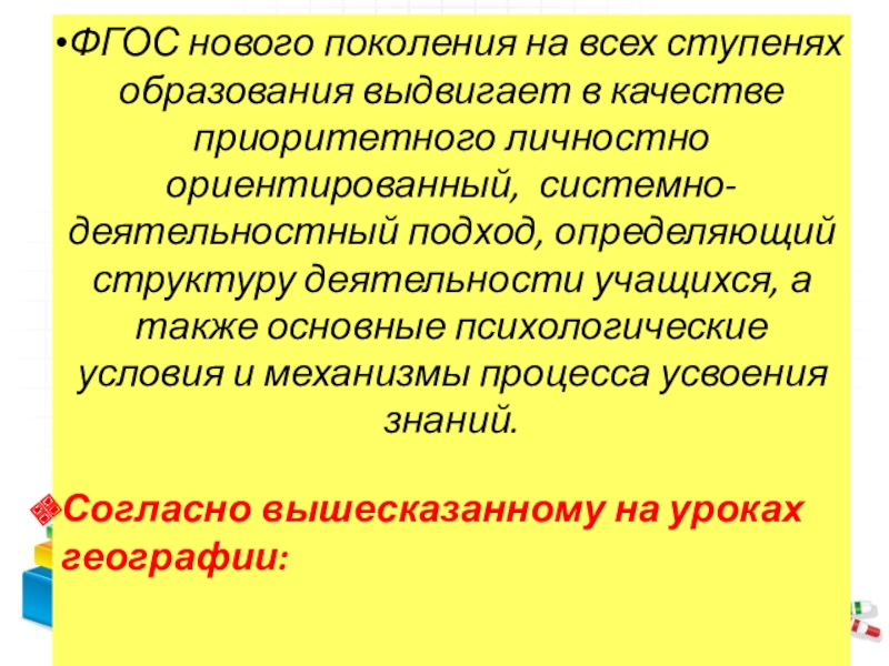 личностно ориентированный, системно-деятельностный подход, определяющий структуру деятельности учащихся, а также основные психологические условия и механизмы процесса усвоения знаний.