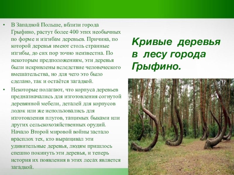 растут более 400 этих необычных по форме и изгибам деревьев. Причина, по которой деревья имеют столь странные изгибы, до сих пор точно неизвестна. По некоторым предположениям, эти деревья были искривлены вследствие человеческого вмешательства, но для чего это было сделано, так и остаётся загадкой.