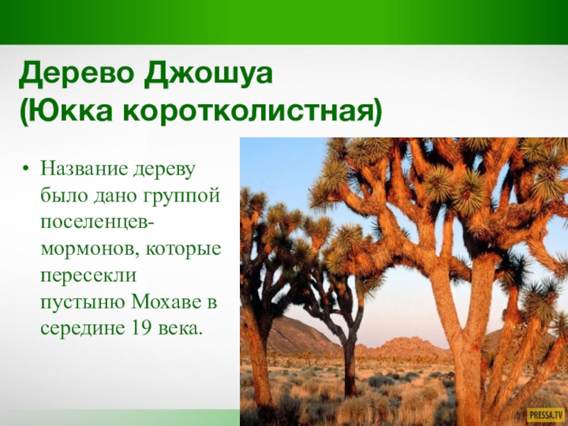Название дереву было дано группой поселенцев-мормонов, которые пересекли пустыню Мохаве в середине 19 века.