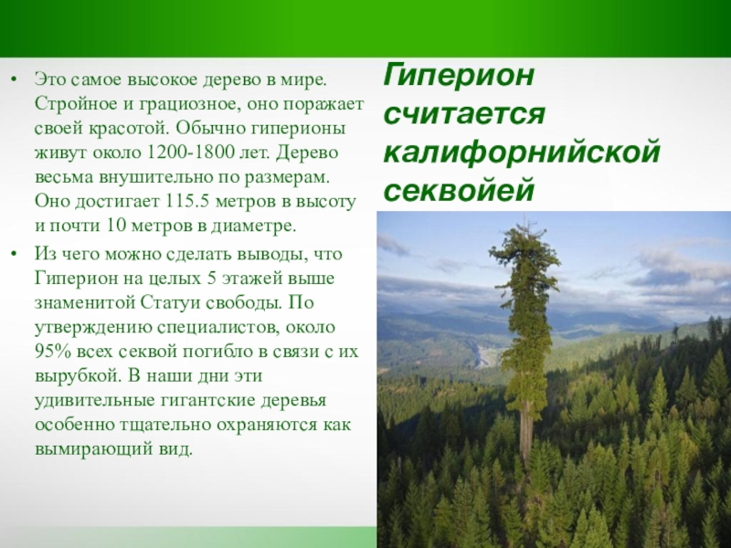 Из чего можно сделать выводы, что Гиперион на целых 5 этажей выше знаменитой Статуи свободы. По утверждению специалистов, около 95% всех секвой погибло в связи с их вырубкой. В наши дни эти удивительные гигантские деревья особенно тщательно охраняются как вымирающий вид.
