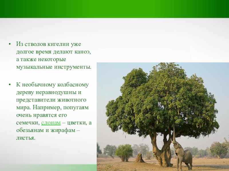 К необычному колбасному дереву неравнодушны и представители животного мира. Например, попугаям очень нравятся его семечки, слонам – цветки, а обезьянам и жирафам – листья.