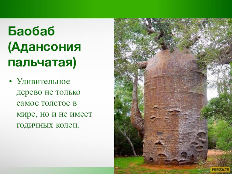 более тысячи лет. Баобаб официально занесен в Красную Книгу, как редкий исчезающий вид. Некоторые деревья достигают 80-90 метров в высоту, при этом обхват ствола составляет до 25 метров.