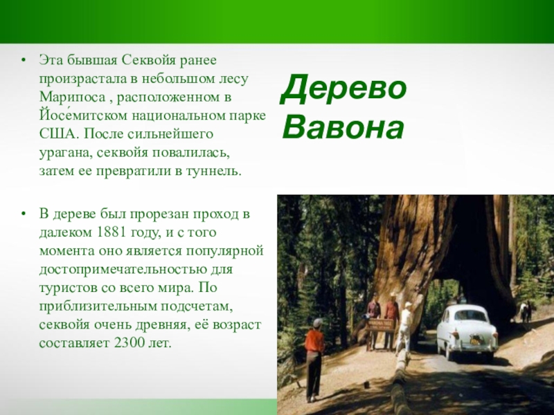 расположенном в Йосе́митском национальном парке США. После сильнейшего урагана, секвойя повалилась, затем ее превратили в туннель.