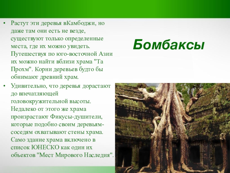 Удивительно, что деревья дорастают до впечатляющей головокружительной высоты. Недалеко от этого же храма произрастают Фикусы-душители, которые подобно своим деревьям-соседям охватывают стены храма. Само здание храма включено в список ЮНЕСКО как один их объектов "Мест Мирового Наследия".