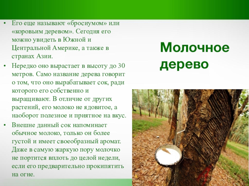 Нередко оно вырастает в высоту до 30 метров. Само название дерева говорит о том, что оно вырабатывает сок, ради которого его собственно и выращивают. В отличие от других растений, его молоко не ядовитое, а наоборот полезное и приятное на вкус.