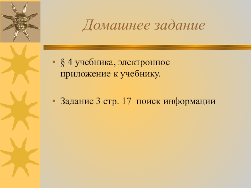 Домашнее задание§ 4 учебника, электронное приложение к учебнику.Задание 3 стр. 17 поиск информации