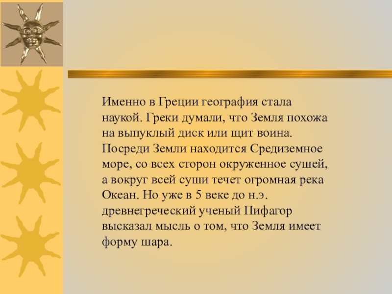 на выпуклый диск или щит воина. Посреди Земли находится Средиземное море, со всех сторон окруженное сушей, а вокруг всей суши течет огромная река Океан. Но уже в 5 веке до н.э. древнегреческий ученый Пифагор высказал мысль о том, что Земля имеет форму шара.