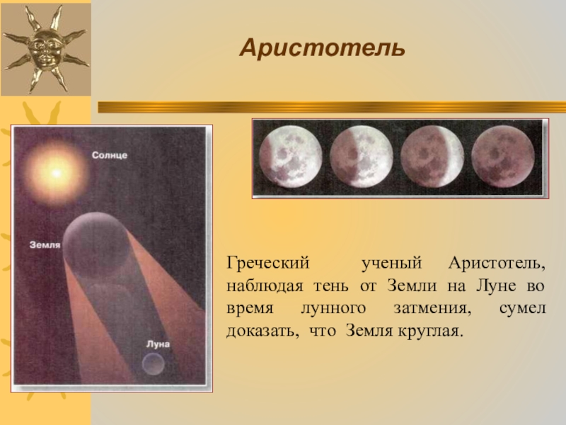 Слайд 12Греческий ученый Аристотель, наблюдая тень от Земли на Луне во время