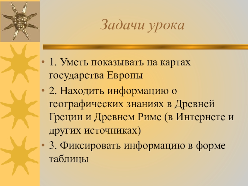 Задачи урока 1. Уметь показывать на картах государства Европы2. Находить информацию о географических знаниях в Древней Греции