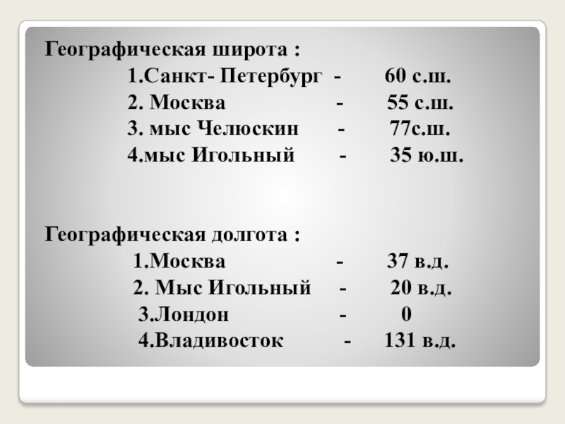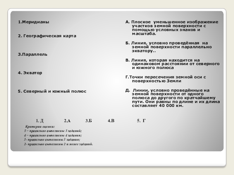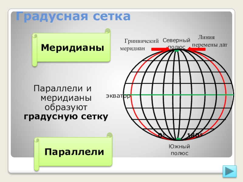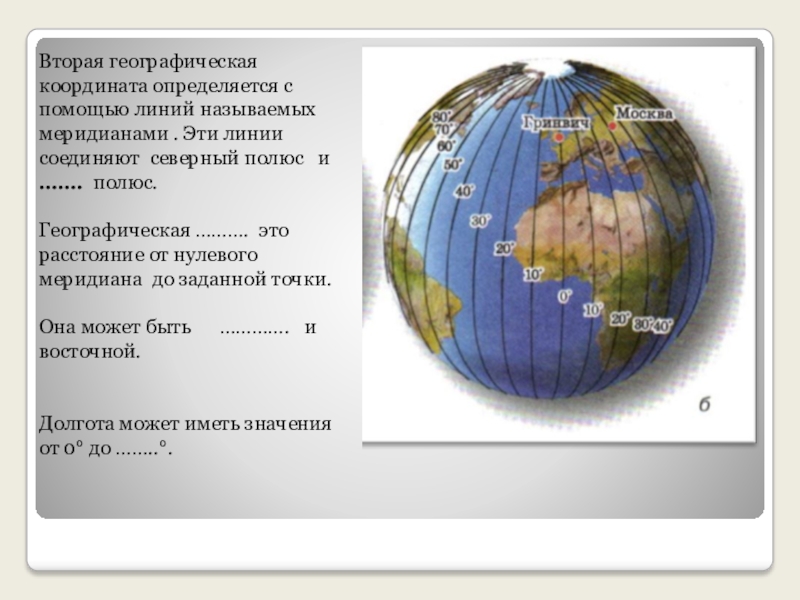 Д. Линии, условно проведённые на земной поверхности от одного полюса до другого по кратчайшему пути. Они равны по длине и их длина составляет 40 000 км.