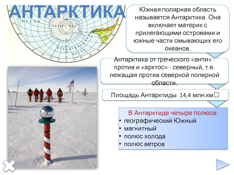 Антарктика от греческого «анти» - против и «арктос» - северный, т.е. лежащая против северной полярной области.
