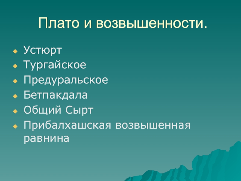 Плато и возвышенности.УстюртТургайскоеПредуральскоеБетпакдалаОбщий СыртПрибалхашская возвышенная равнина