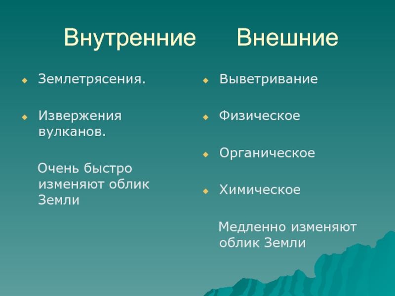 Внутренние   ВнешниеЗемлетрясения.Извержения вулканов.  Очень быстро изменяют облик ЗемлиВыветриваниеФизическоеОрганическоеХимическое  Медленно изменяют облик Земли