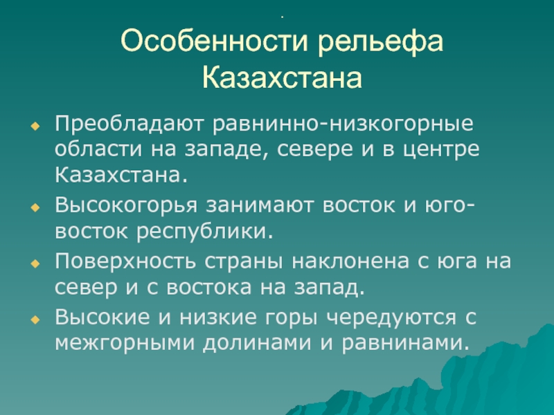 . Особенности рельефа Казахстана Преобладают равнинно-низкогорные области на западе, севере и в центре Казахстана.Высокогорья занимают восток