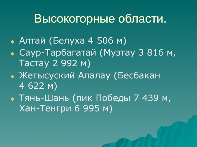 Высокогорные области.Алтай (Белуха 4 506 м)Саур-Тарбагатай (Музтау 3 816 м, Тастау 2 992 м)Жетысуский Алалау (Бесбакан