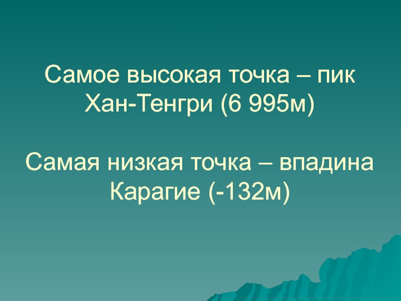 Самое высокая точка – пик Хан-Тенгри (6 995м)  Самая низкая точка – впадина Карагие (-132м)