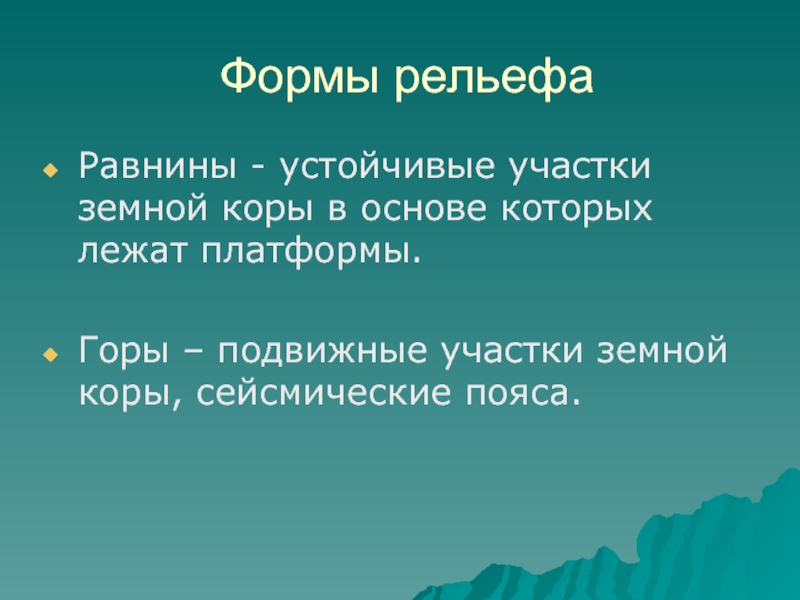Формы рельефаРавнины - устойчивые участки земной коры в основе которых лежат платформы.Горы – подвижные участки земной коры,