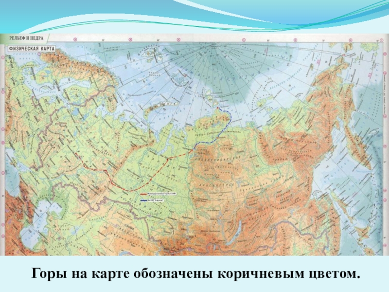 Слайд 7Горы на карте обозначены коричневым цветом.
