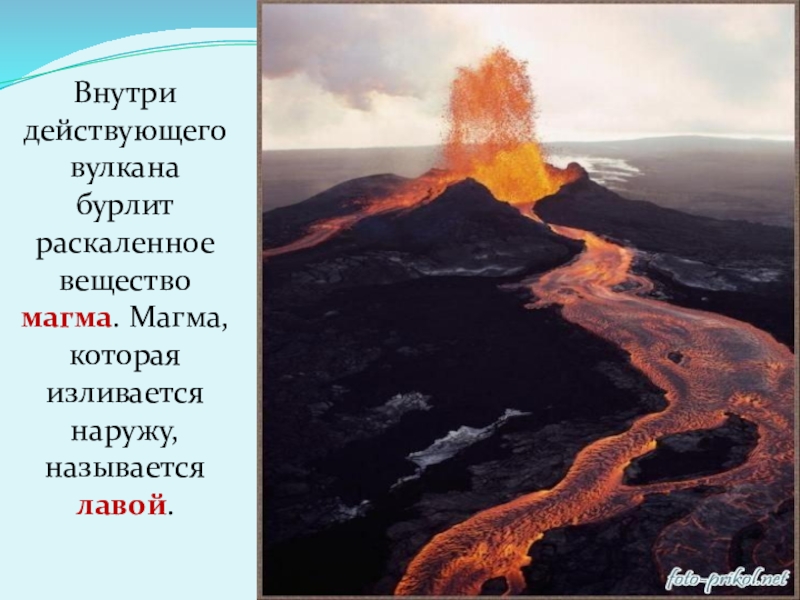 Слайд 11Внутри действующего вулкана бурлит раскаленное вещество магма. Магма, которая изливается наружу,