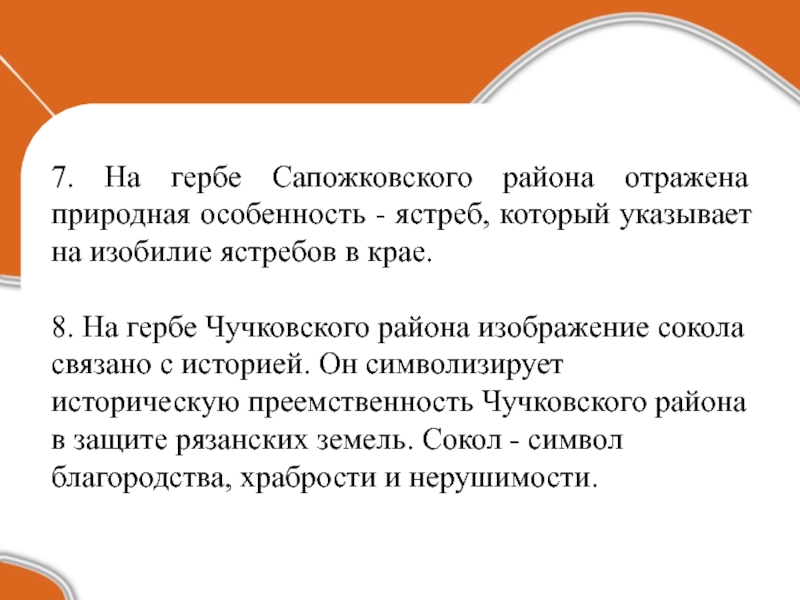 8. На гербе Чучковского района изображение сокола связано с историей. Он символизирует историческую преемственность Чучковского района в защите рязанских земель. Сокол - символ благородства, храбрости и нерушимости.